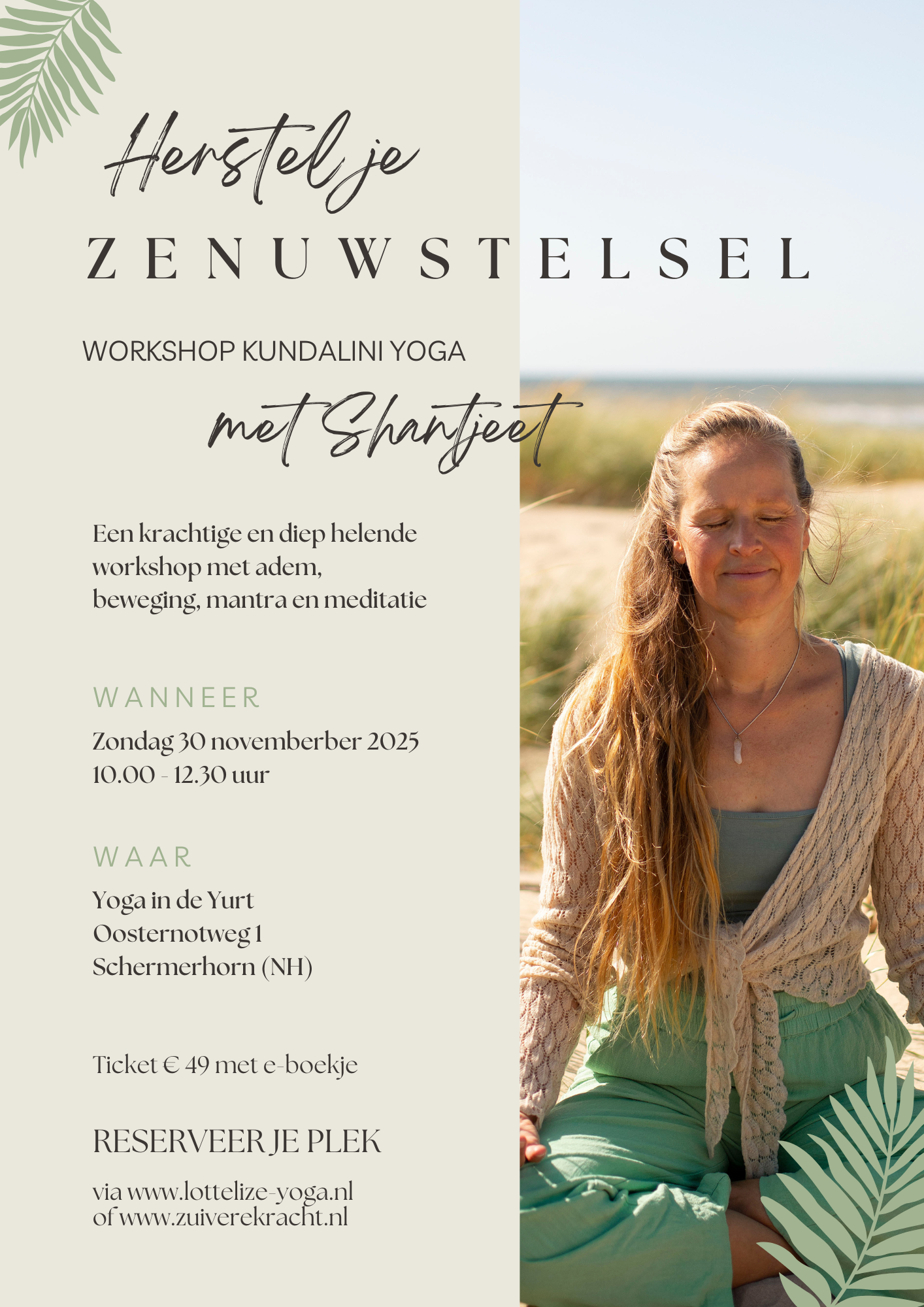 In deze workshop ervaar je de diep helende en ontspannende werking van kundalini yoga op je zenuwstelsel en je mind. We zijn met maximaal 10 personen in de prachtige yurt van Lotte in het landelijke Schermerhorn.